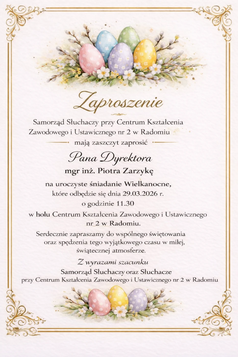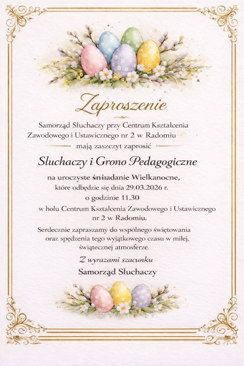 W Centrum Kształcenia Zawodowego i Ustawicznego nr 2 w Radomiu odbędzie się uroczyste śniadanie wielkanocne, organizowane przez Samorząd Słuchaczy. Wydarzenie będzie okazją do wspólnego spotkania, rozmów oraz świątecznego wprowadzenia się w atmosferę nadchodzącej Wielkanocy.
